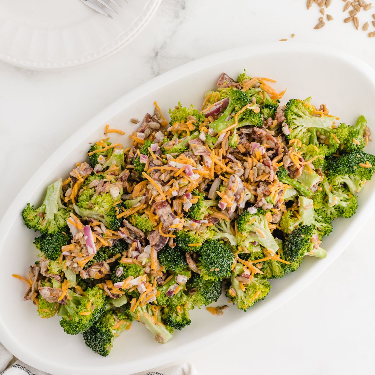Classic broccoli salad is made with raw broccoli, bacon, red onion, sunflower seeds, shredded cheddar, and a creamy dressing made with mayo, lemon juice, and sugar.