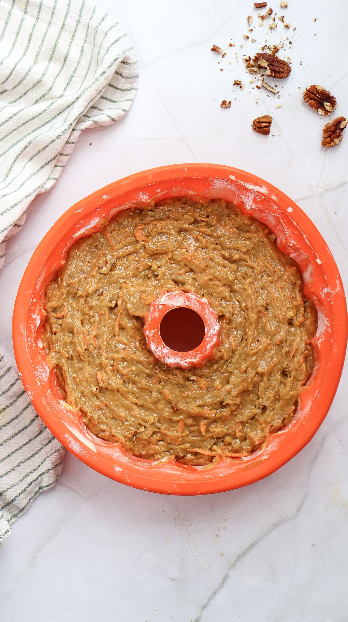 Step 4: Fold in the freshly grated carrots and chopped nuts, then pour the batter into the prepared bundt pan.