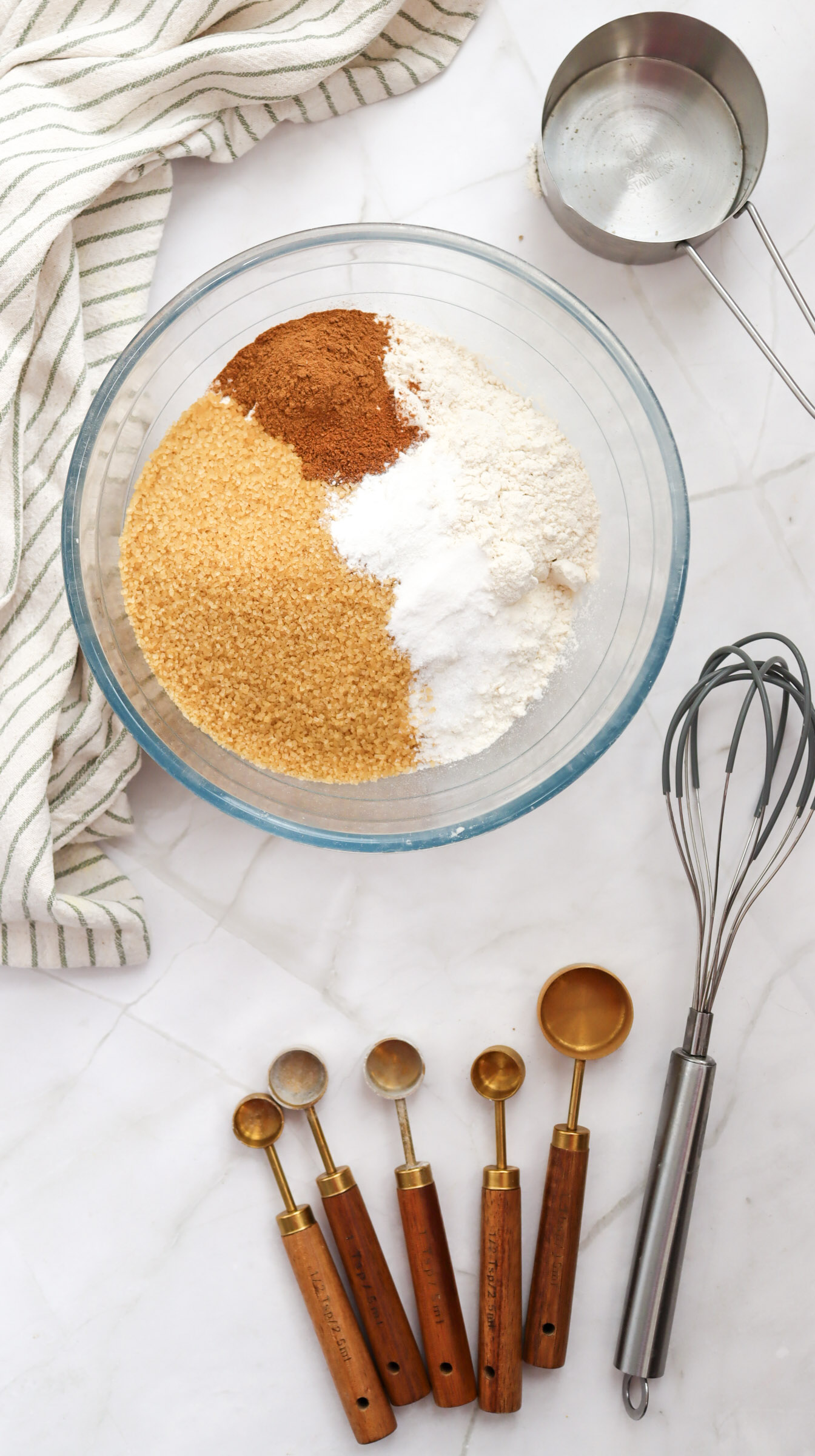 2. Ina large bowl, whisk together the flour, brown sugar, baking powder, baking soda, cinnamon, nutmeg, and salt.