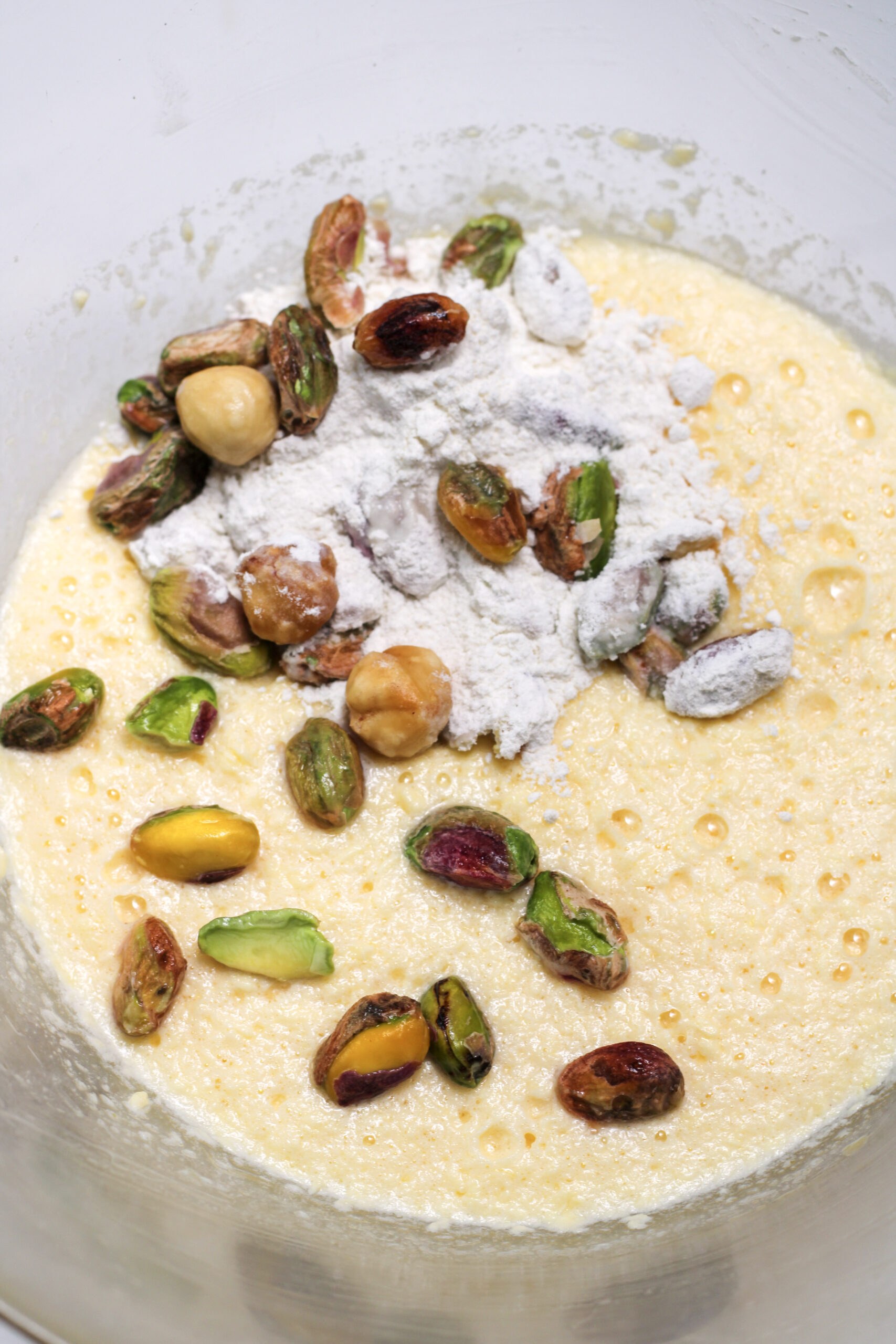 - In a separate bowl, combine flour and baking powder. Soak the pistachios and hazelnuts in water for 1 minute, drain, then stir into the flour (reserving 2 tablespoons pistachios for garnish). Gently fold the flour mixture into the batter until incorporated.