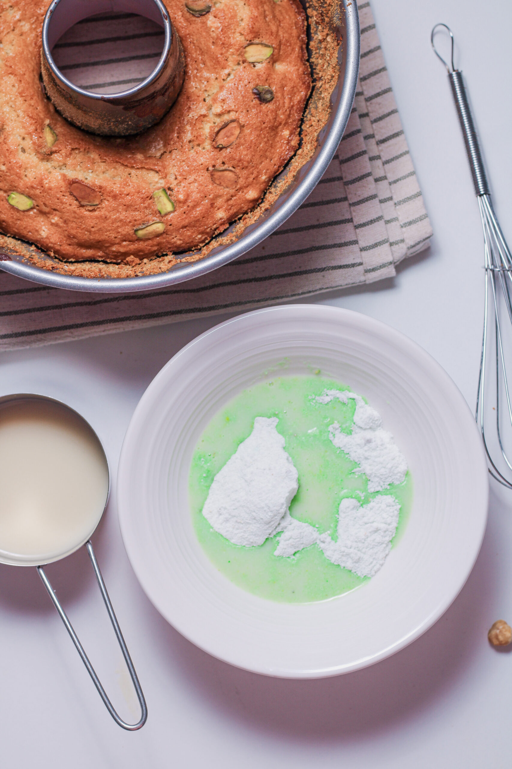 Step 4: Pour the batter into the bundt pan and bake for about 40 minutes, or until a toothpick comes out clean. Cool completely. For the glaze, whisk the pistachio pudding mix with 1½ cups of milk until set, then spread over the cooled cake. Garnish with reserved pistachios.