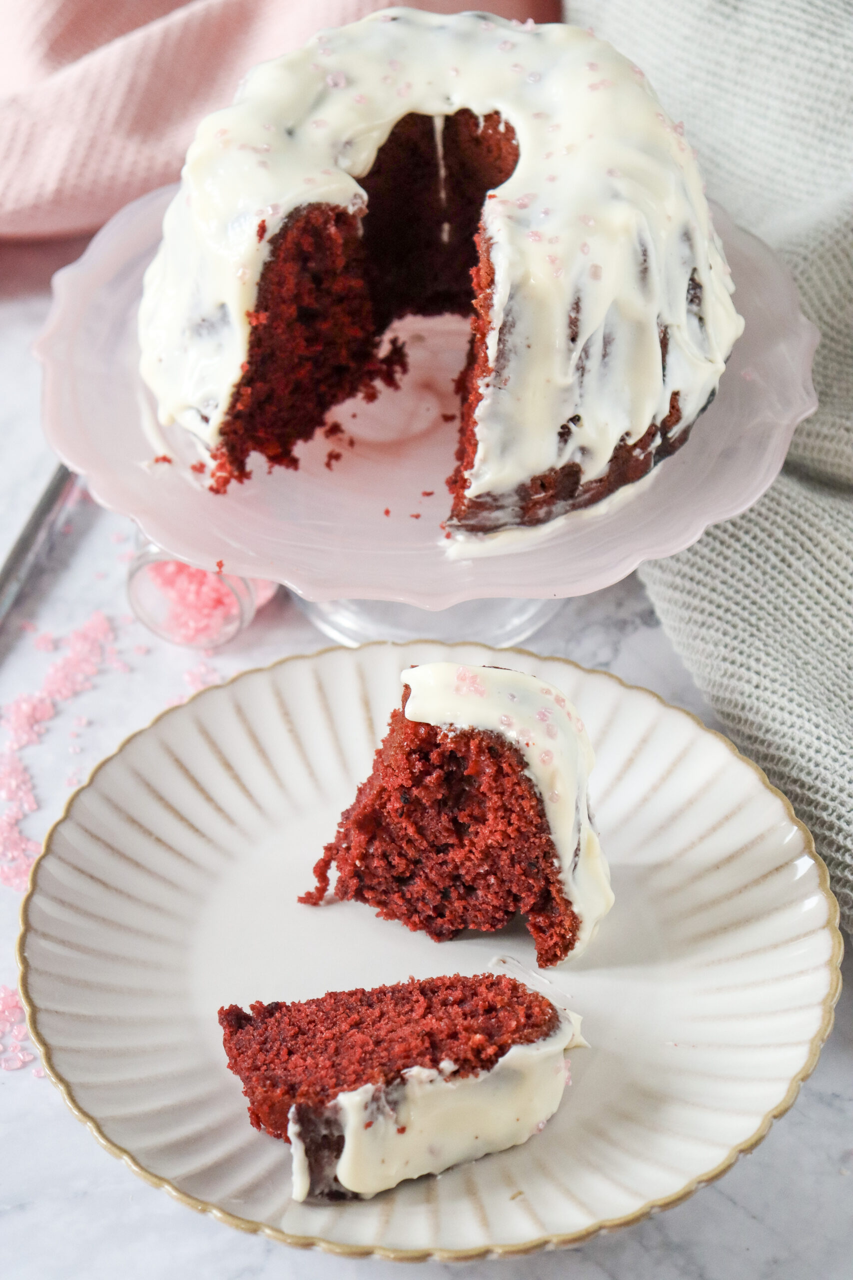 8. After the cake has cooled completely, spread the cream cheese frosting over the top and sides of the bundt cake. Decorate with pink or red sprinkles to add a touch of love.