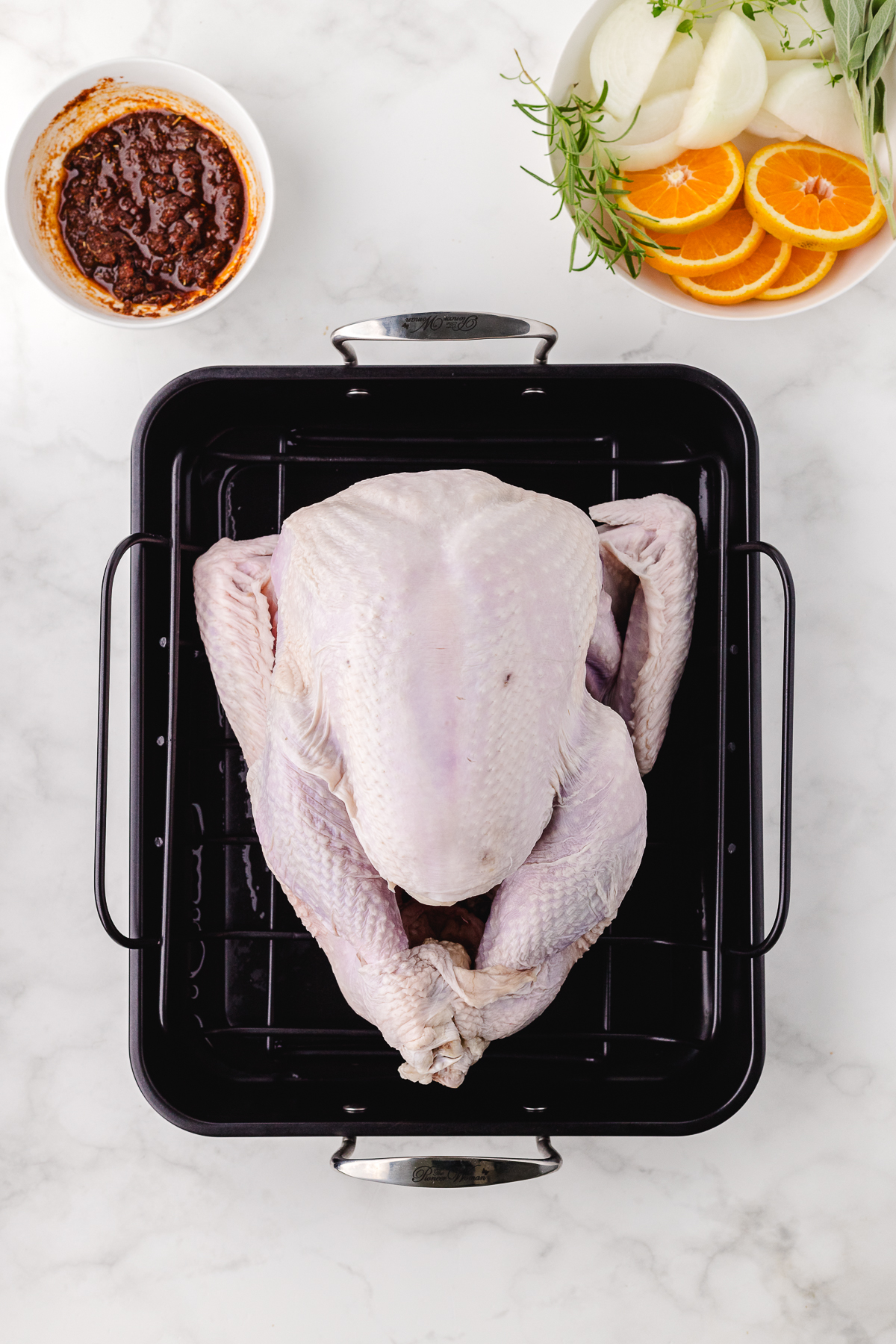 Step 3: Stuff the turkey cavity with orange slices, onion chunks, and sprigs of fresh herbs. Don’t overpack - airflow helps it roast evenly.