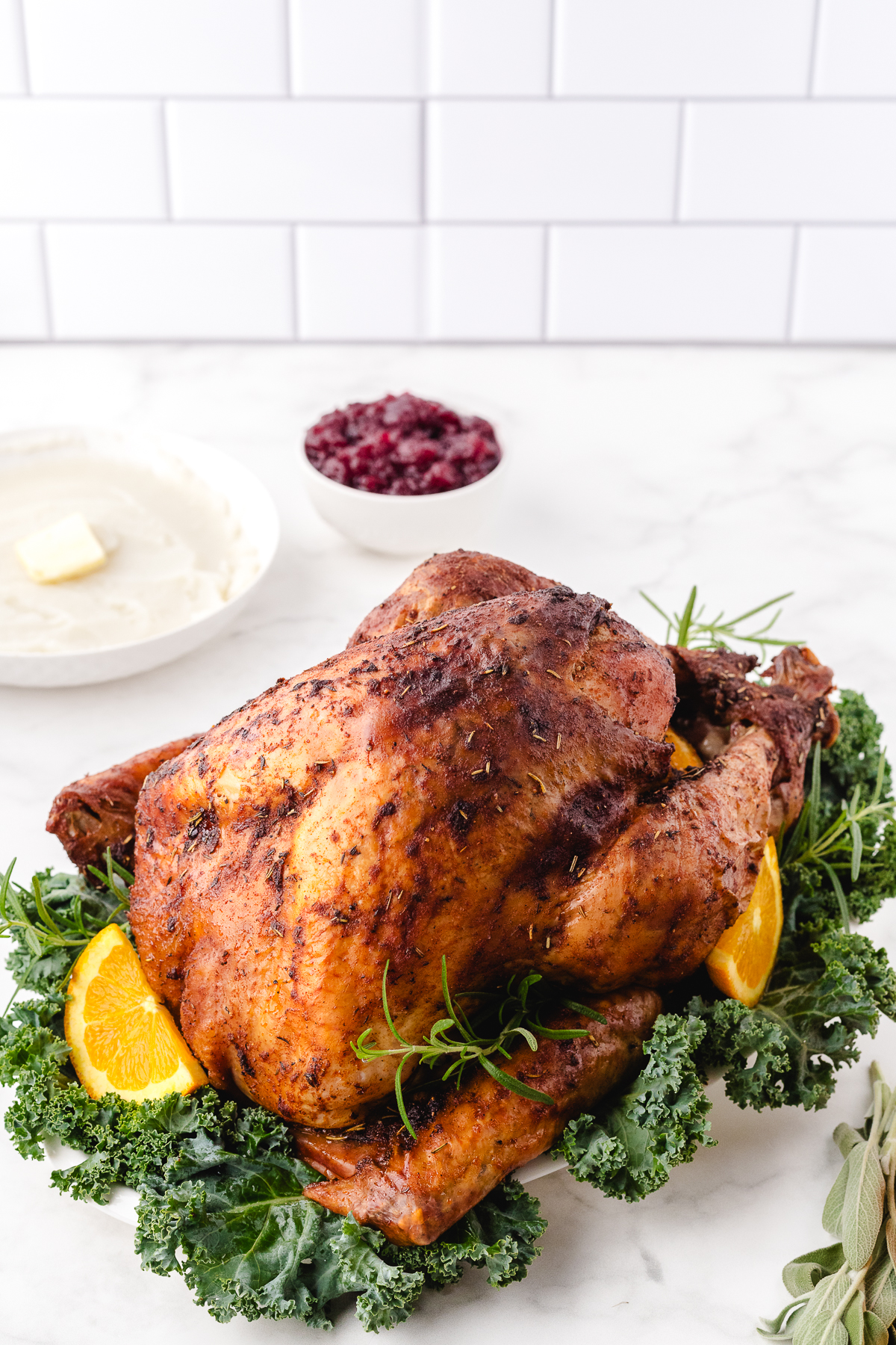 Step 6: Let the turkey rest for 30 minutes before carving. The temperature will rise to a perfect 165°F. Serve on a platter with extra citrus and fresh herbs for a pretty holiday touch.